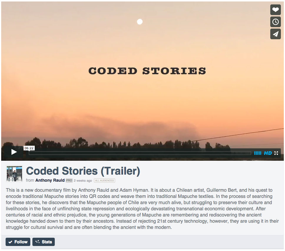 The first iteration of the Encoded Textiles project involved a Mapuche community in Chile, the artist's home country. It was inspired by his observation that the “Aztec Code,” a specific form of QR (“Quick Response”) code, with its tiered pyramid-shaped structures, closely resembles graphic designs in the textile arts of Native peoples. Returning to Chile, the artist collaborated with Mapuche weaver Anita Paillamil, poet Graciela Huinao, and other community members to bring to light the relationship of Indigenous art forms and cultural identities revealed through the encoded works. Viewers scan the QR codes with their smart phones, thereby opening access to the Mapuche world through video clips. Their world, as it turns out, is not so remote from ours– fraught with the same forces of ecological degradation and commercial exploitation of resources, yet also filtered through life affirming renewal rituals and cultural celebrations that this project captures in multi-media formats.