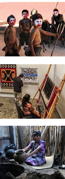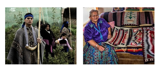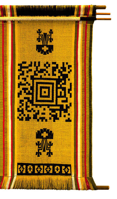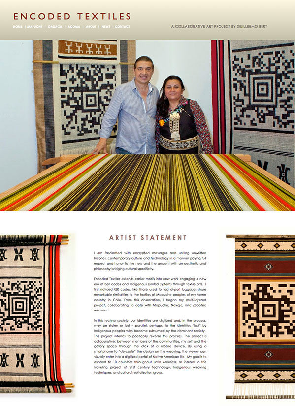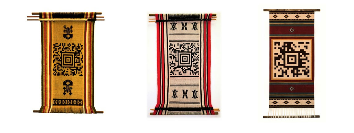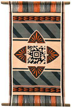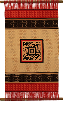 The first iteration of the Encoded Textiles project involved a Mapuche community in Chile, the artist's home country. It was inspired by his observation that the “Aztec Code,” a specific form of QR (“Quick Response”) code, with its tiered pyramid-shaped structures, closely resembles graphic designs in the textile arts of Native peoples. Returning to Chile, the artist collaborated with Mapuche weaver Anita Paillamil, poet Graciela Huinao, and other community members to bring to light the relationship of Indigenous art forms and cultural identities revealed through the encoded works. Viewers scan the QR codes with their smart phones, thereby opening access to the Mapuche world through video clips. Their world, as it turns out, is not so remote from ours– fraught with the same forces of ecological degradation and commercial exploitation of resources, yet also filtered through life affirming renewal rituals and cultural celebrations that this project captures in multi-media formats.